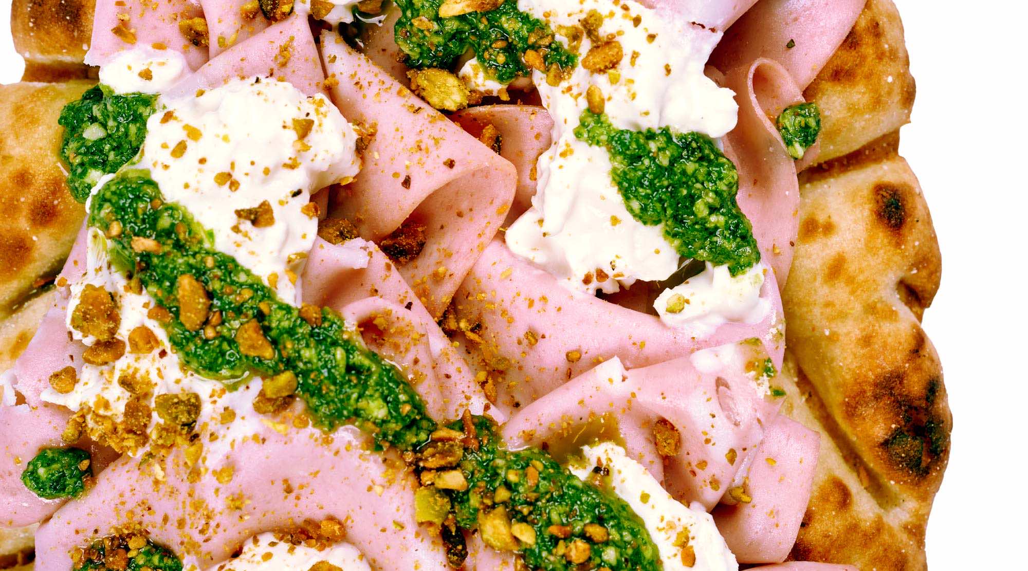 A golden, olive oil–toasted PINZZA™ topped with delicate slices of mortadella, creamy stracciatella, and a bright pesto drizzle. Finished with toasted pistachios for a rich, nutty crunch and a balanced combination of crisp texture, creamy cheese, and classic Italian flavor.